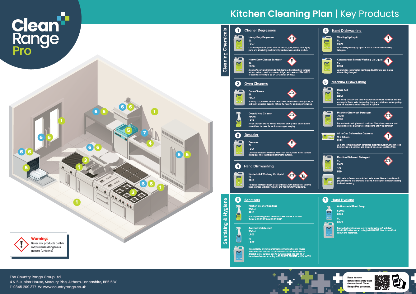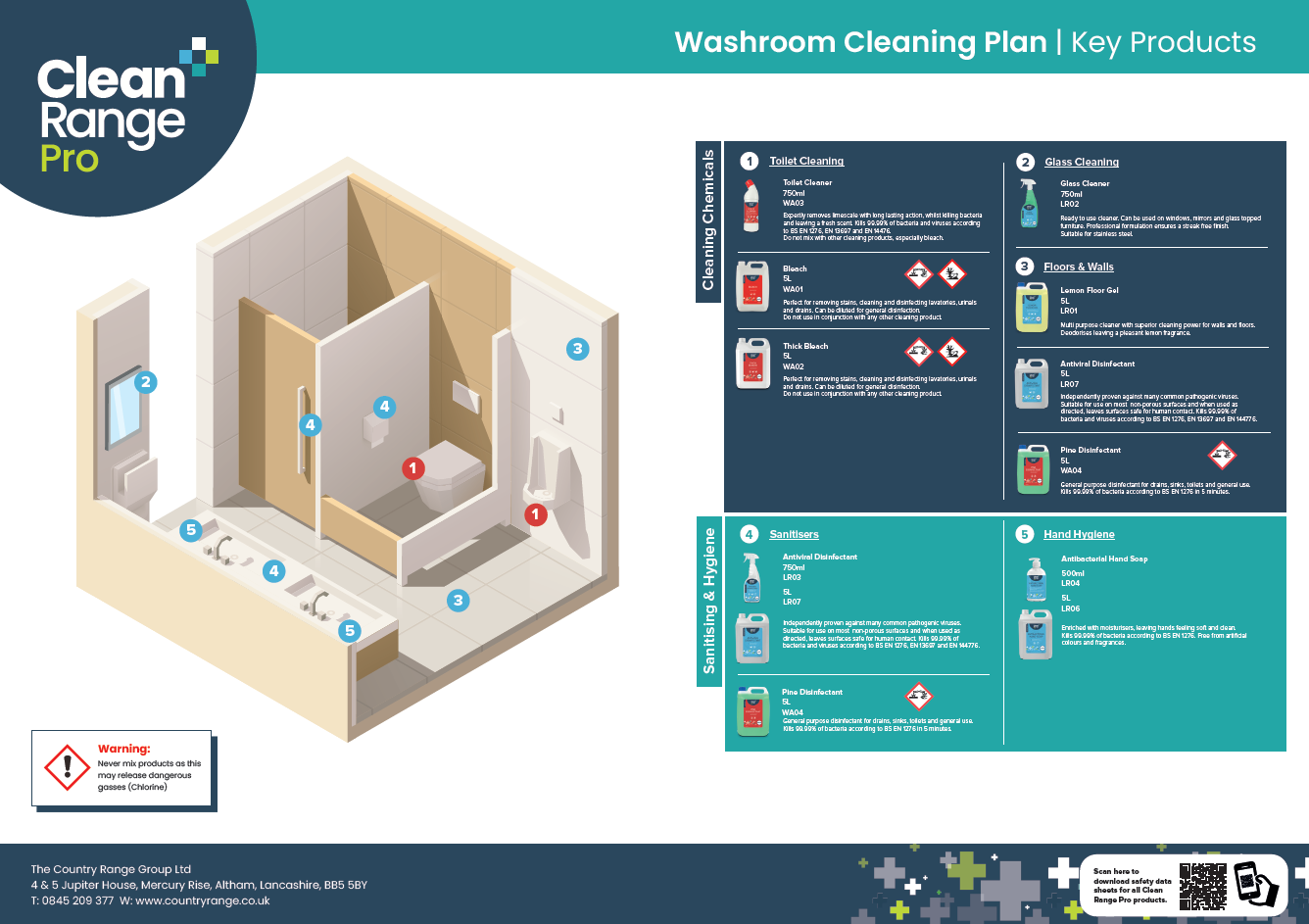 Download our free wall chart templates for safe use of Clean Range Pro products in your kitchen and washroom areas. Display the charts for all staff to use to keep everybody safe and ensure products are used in appropriate areas.